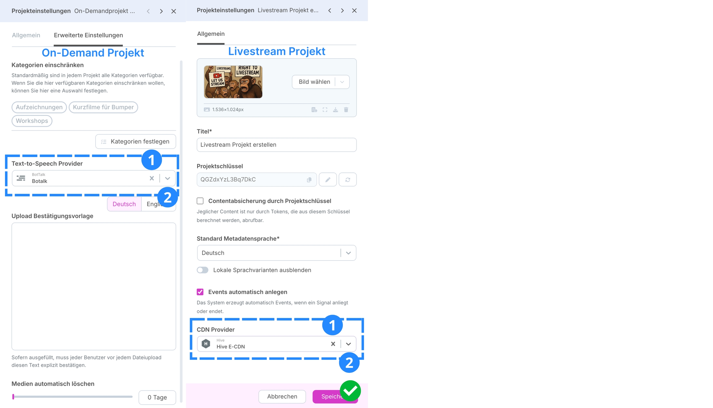 Abbildung: Side Sheet "Projekteinstellungen" mit Auswahl für "Text-to-Speech Provider" und "CDN Provider"