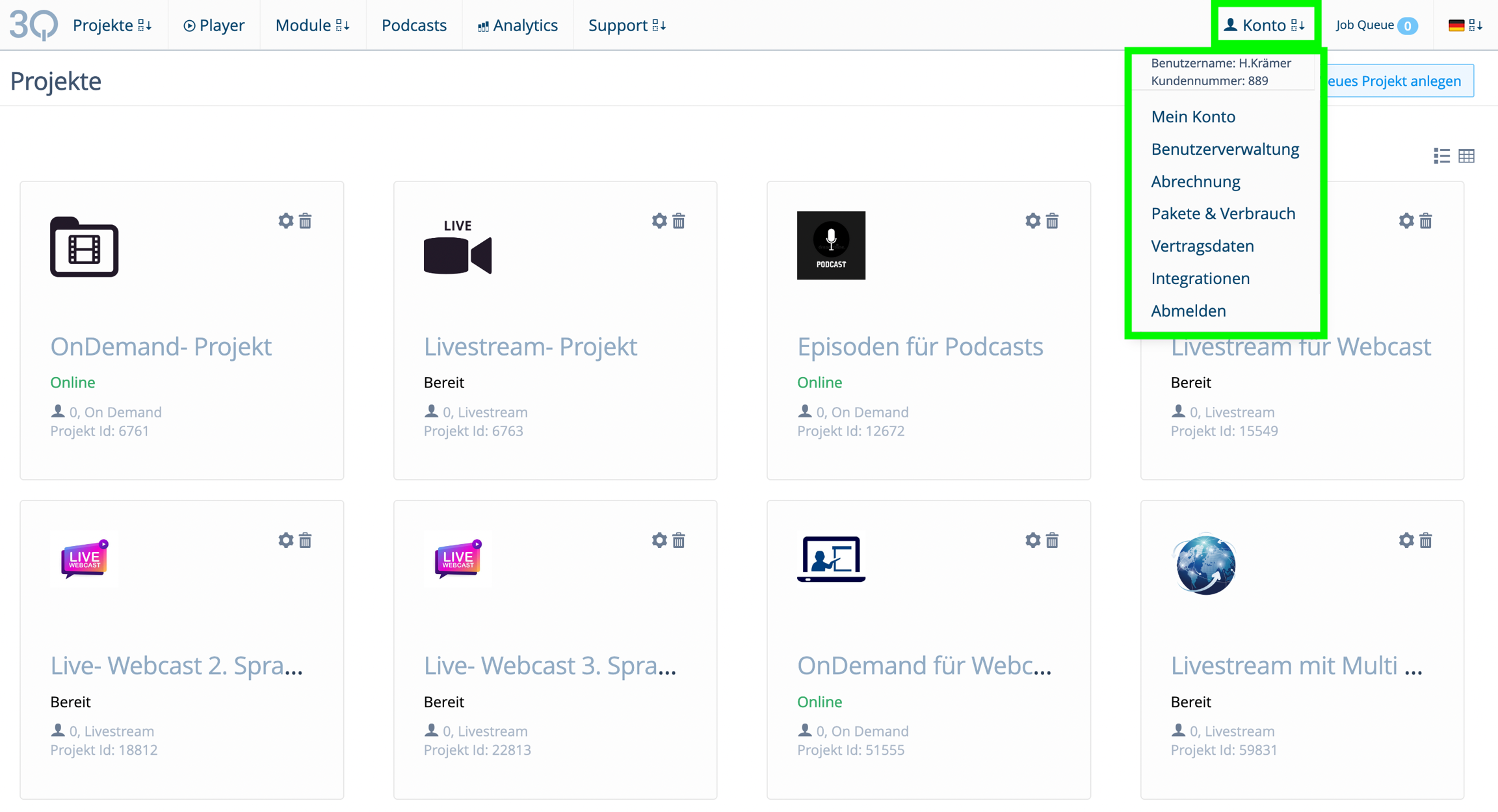 Übersicht zur Kontoverwaltung, Abmelden/Logout, Kundennummer und Benutzername für Support-Anfragen