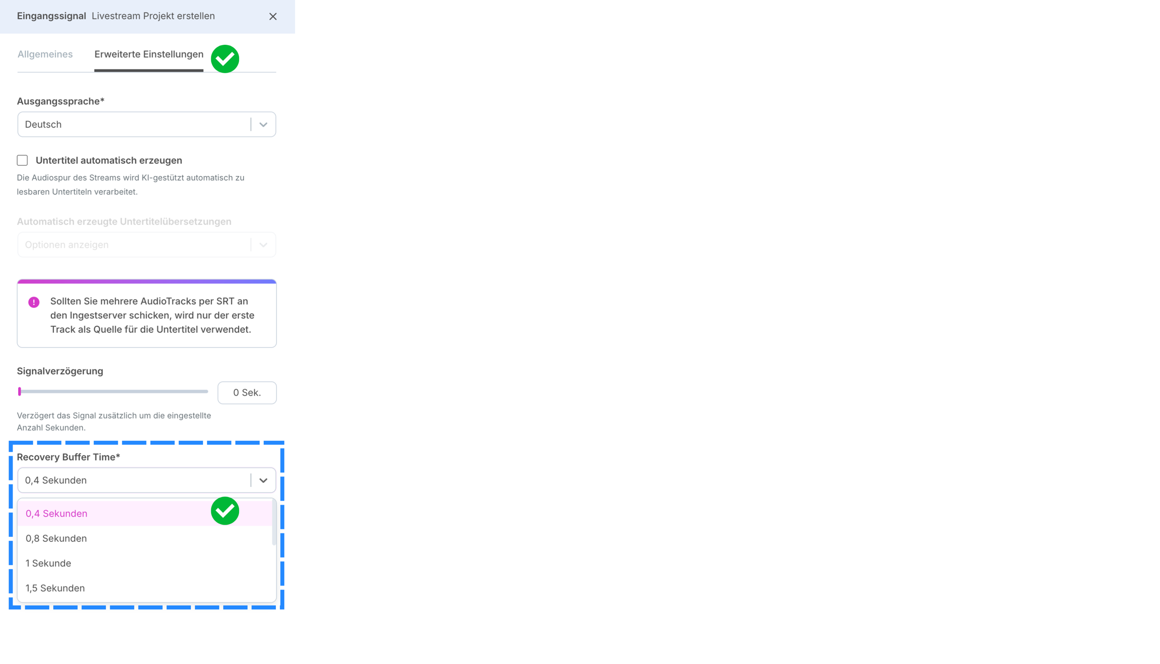 Wenn Sie für das Eingangssignal den Streamtyp "SRT" gewählt haben wird im Side Sheet "Eingangssignal" unter "Erweiterte Einstellungen" die Option "Recovery Buffer Time" hinzugefügt.