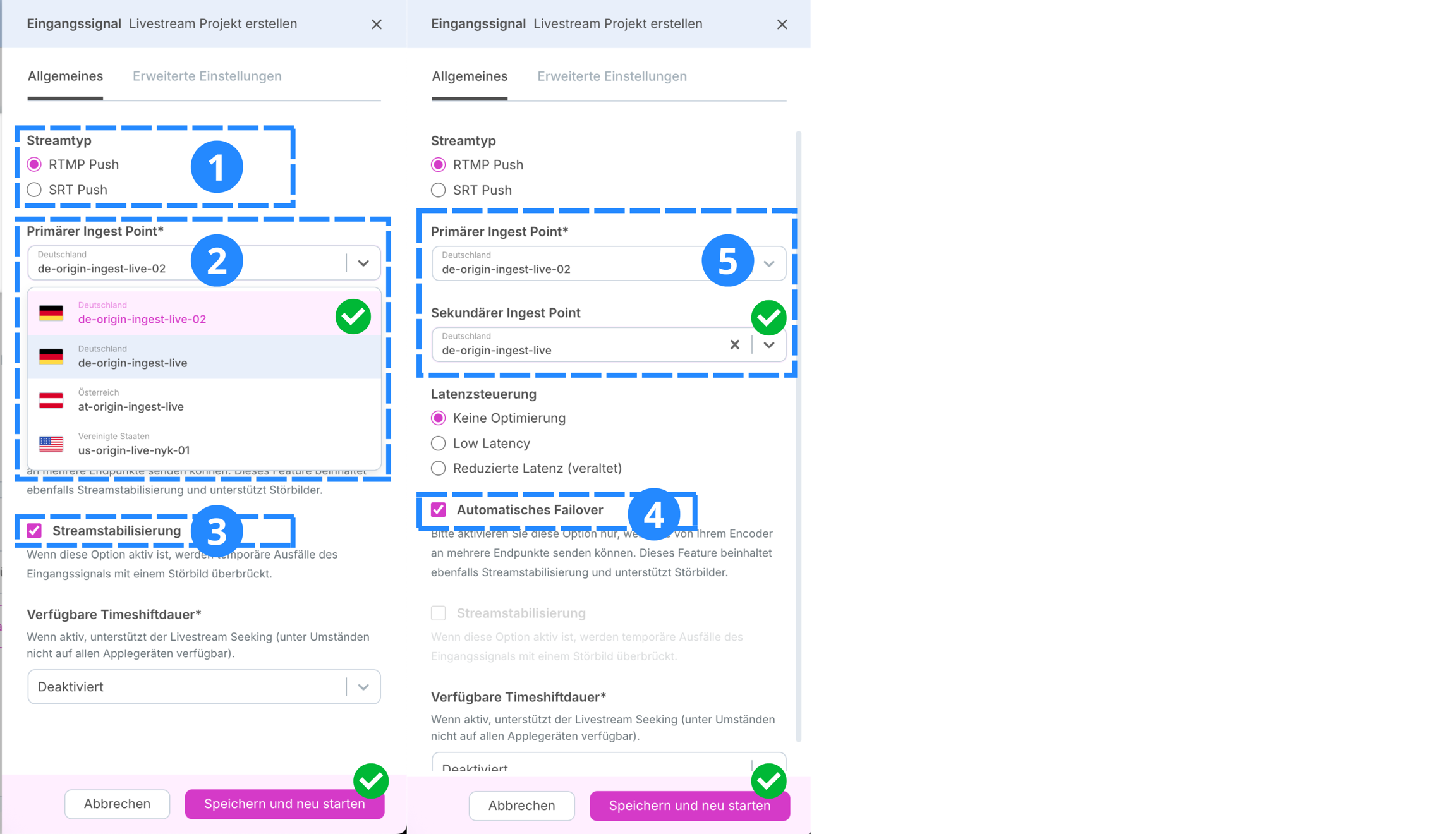 Wählen Sie "Streamtyp" und "Ingestpoint(s)" für das Eingangssignal.