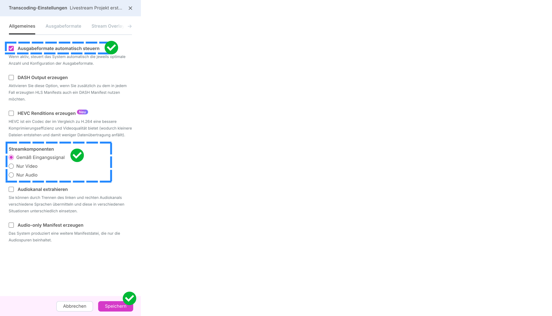 Für "Streamkomponenten" ist die Option "Gemäß Eingangssignal" gewählt.