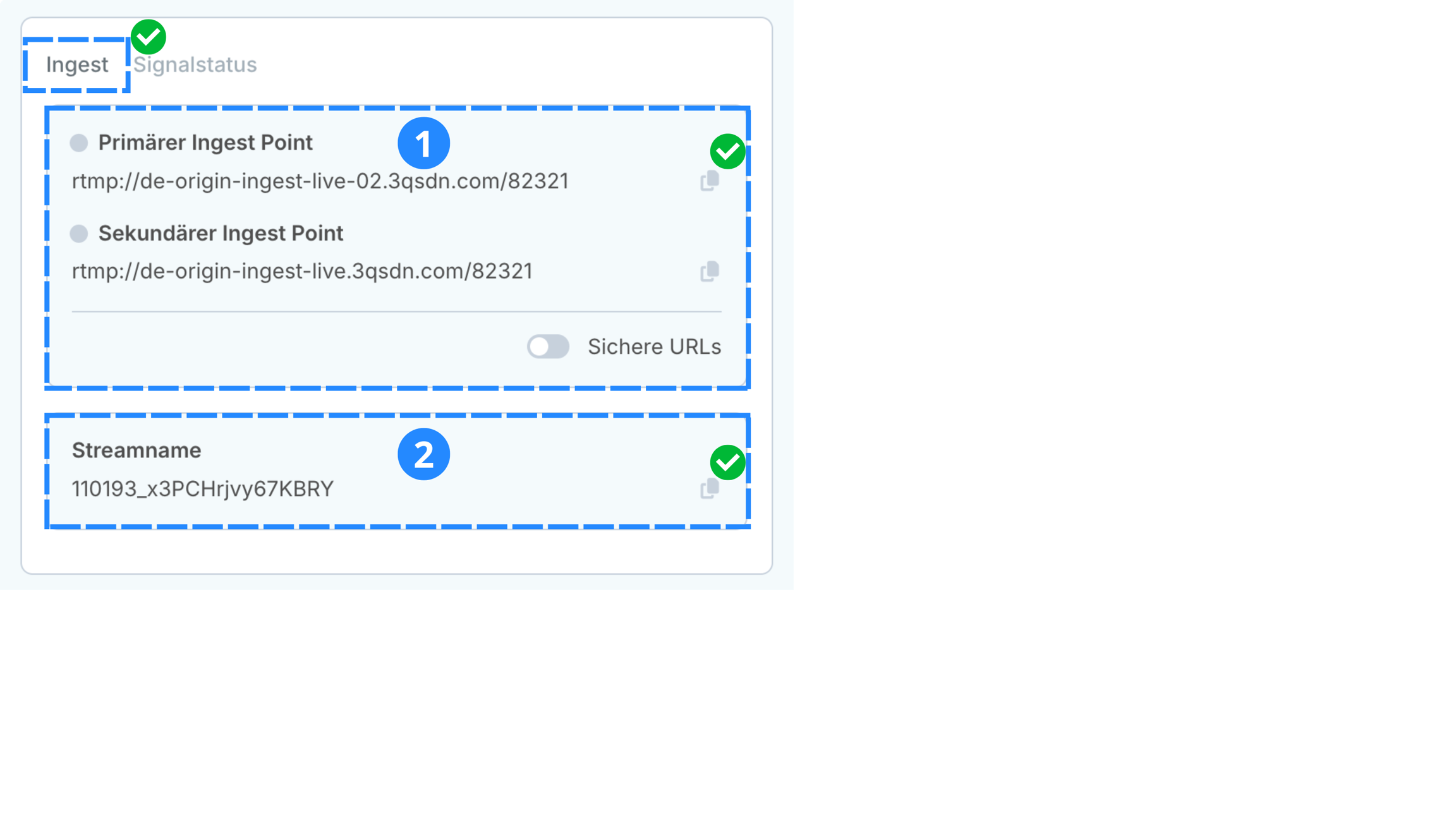 die URL zum Primären Ingest Point (bei einfacher Signalannahme) oder zusätzlich die URL für den Sekundären Ingest Point (bei redundanter Signalanlieferung) sowie