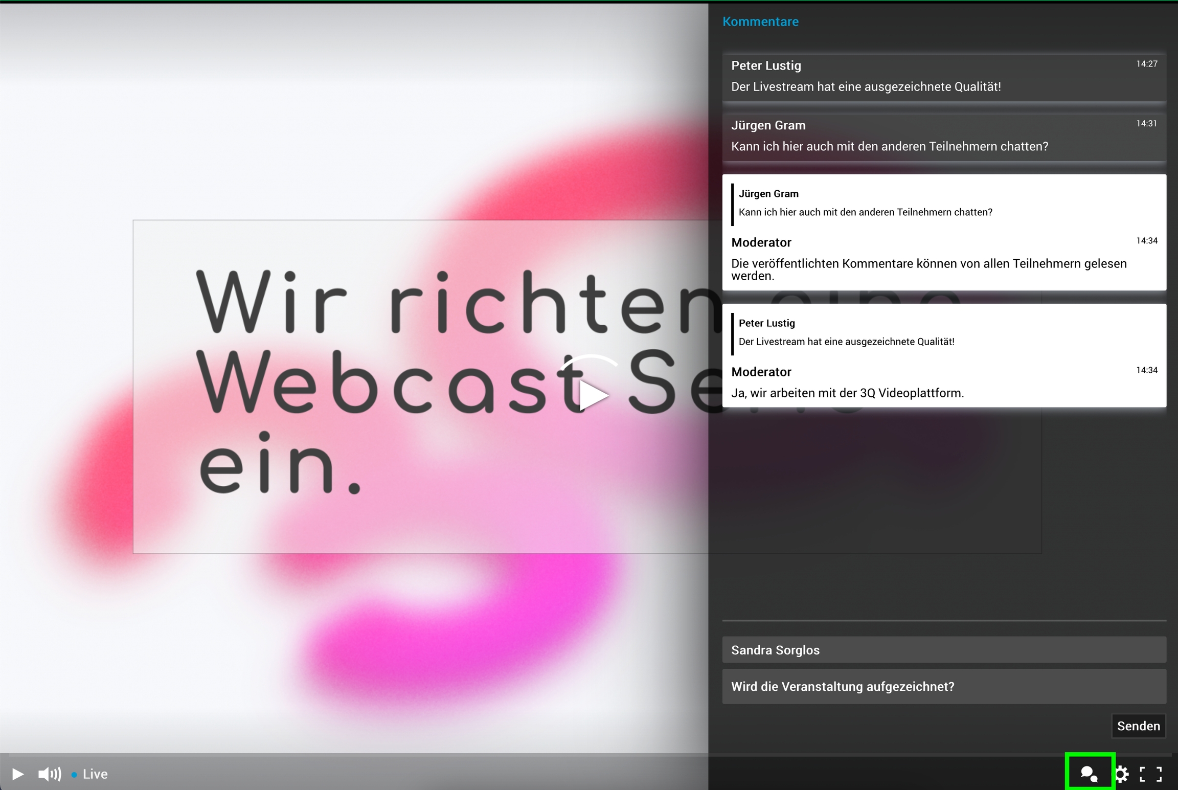 Teilnehmer sollen nur Fragen stellen - die Bezeichnung "Kommentare" im Kommentarfenster wird über die Player API (https://player.docs.3q.video/player-api/labels) in "Ihre Fragen" geändert.