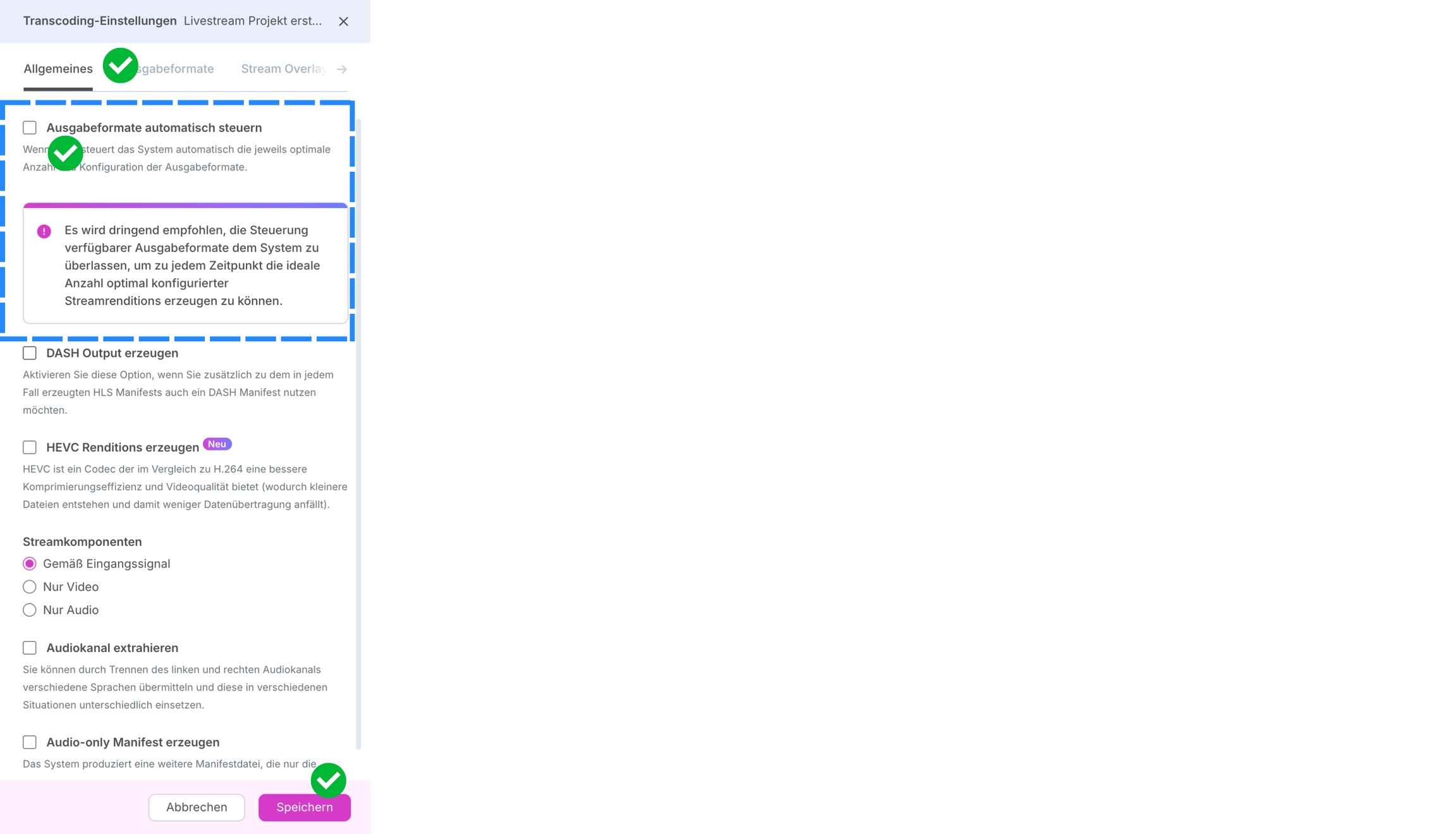 Damit Sie Transcoder manuell auswählen oder bearbeiten können muss im Side Sheet Transcoding-Einstellungen die Einstellungsoption "Ausgabeformate automatisch steuern" inaktiv sein.