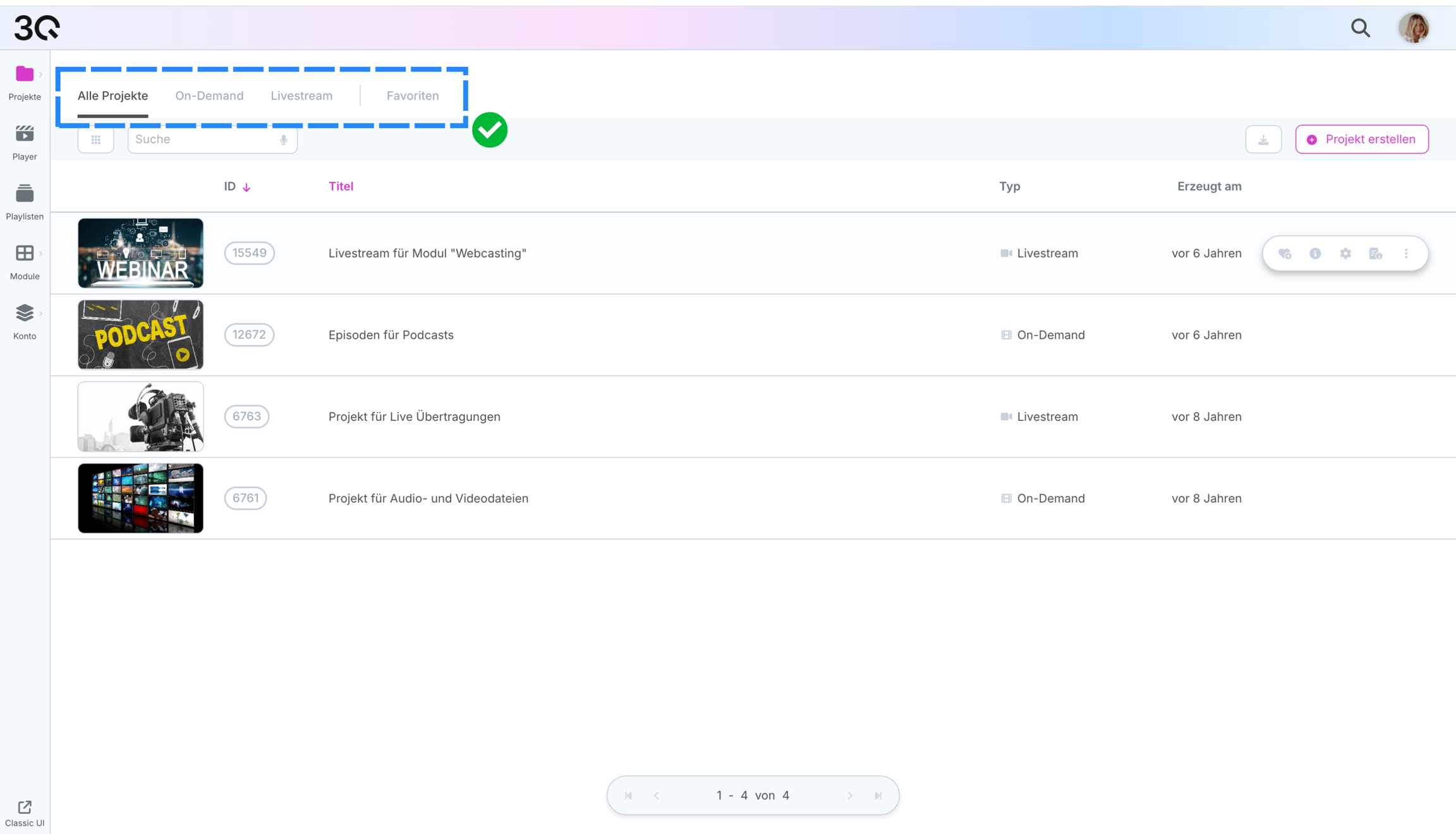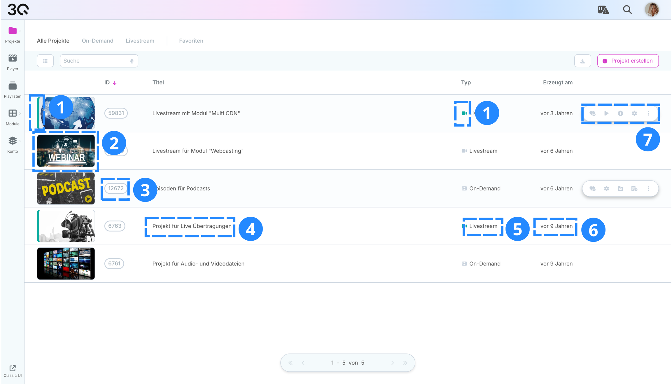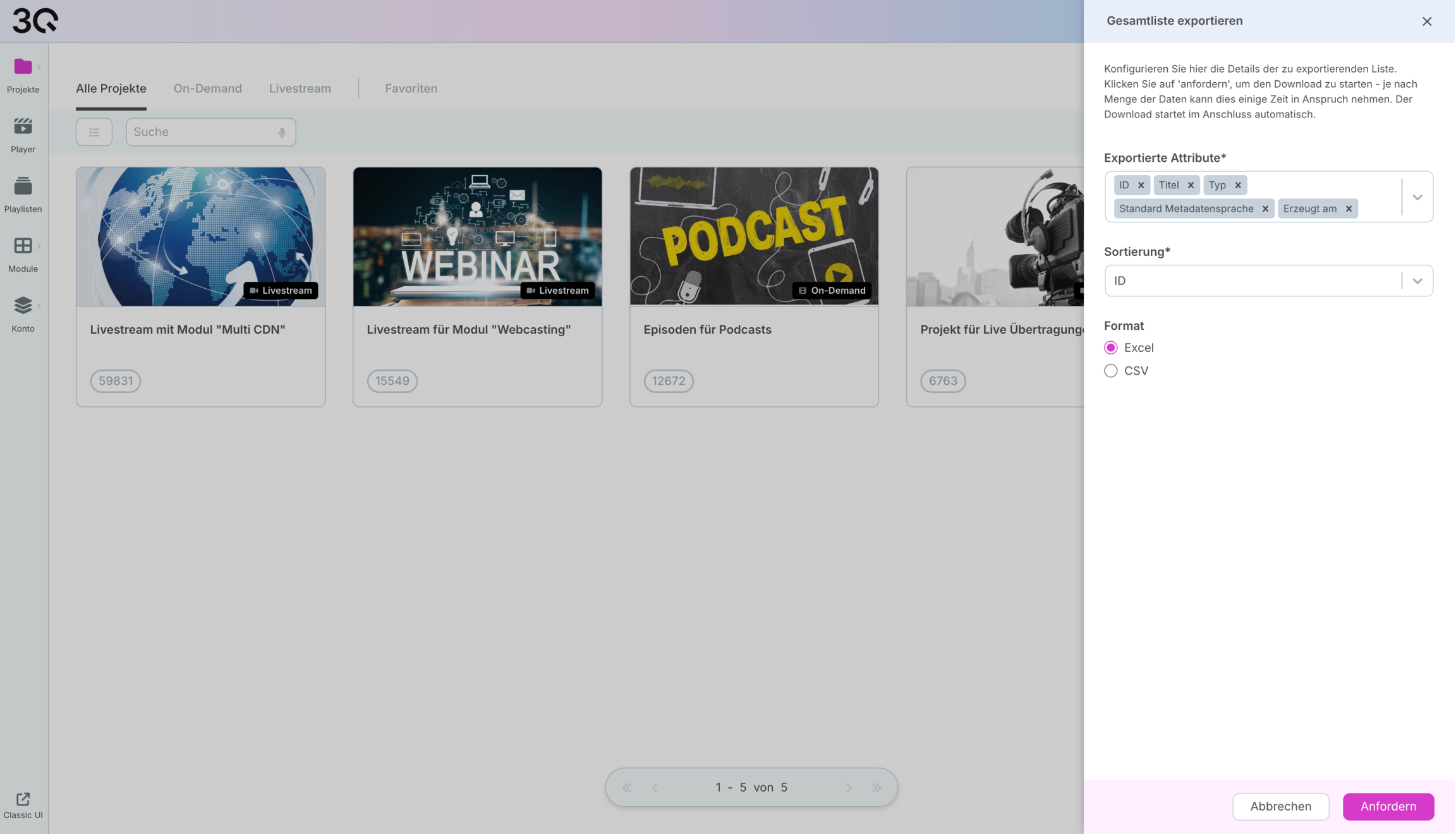 Zeigt den Projekttyp, On-Demand oder Livestream.
