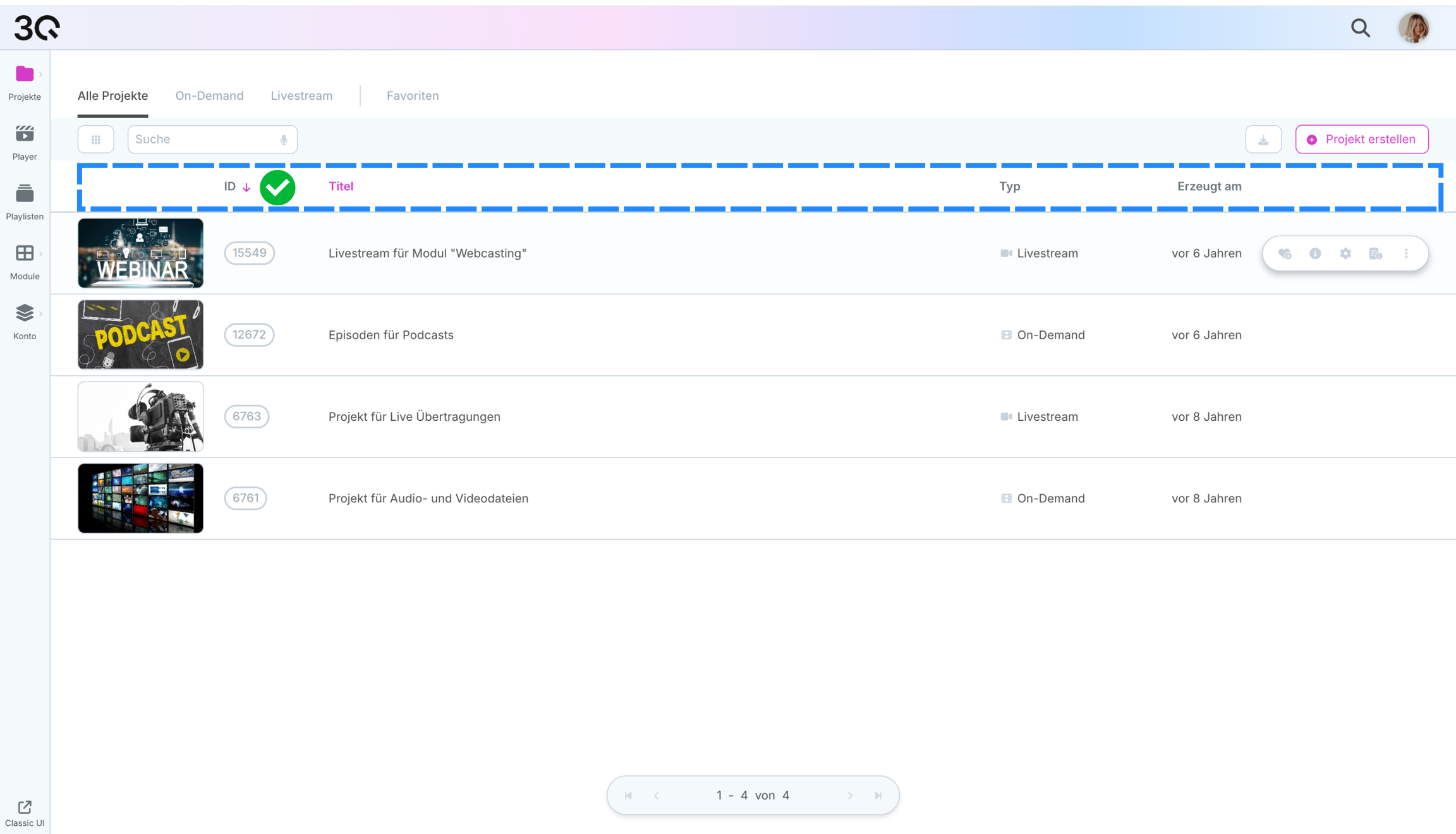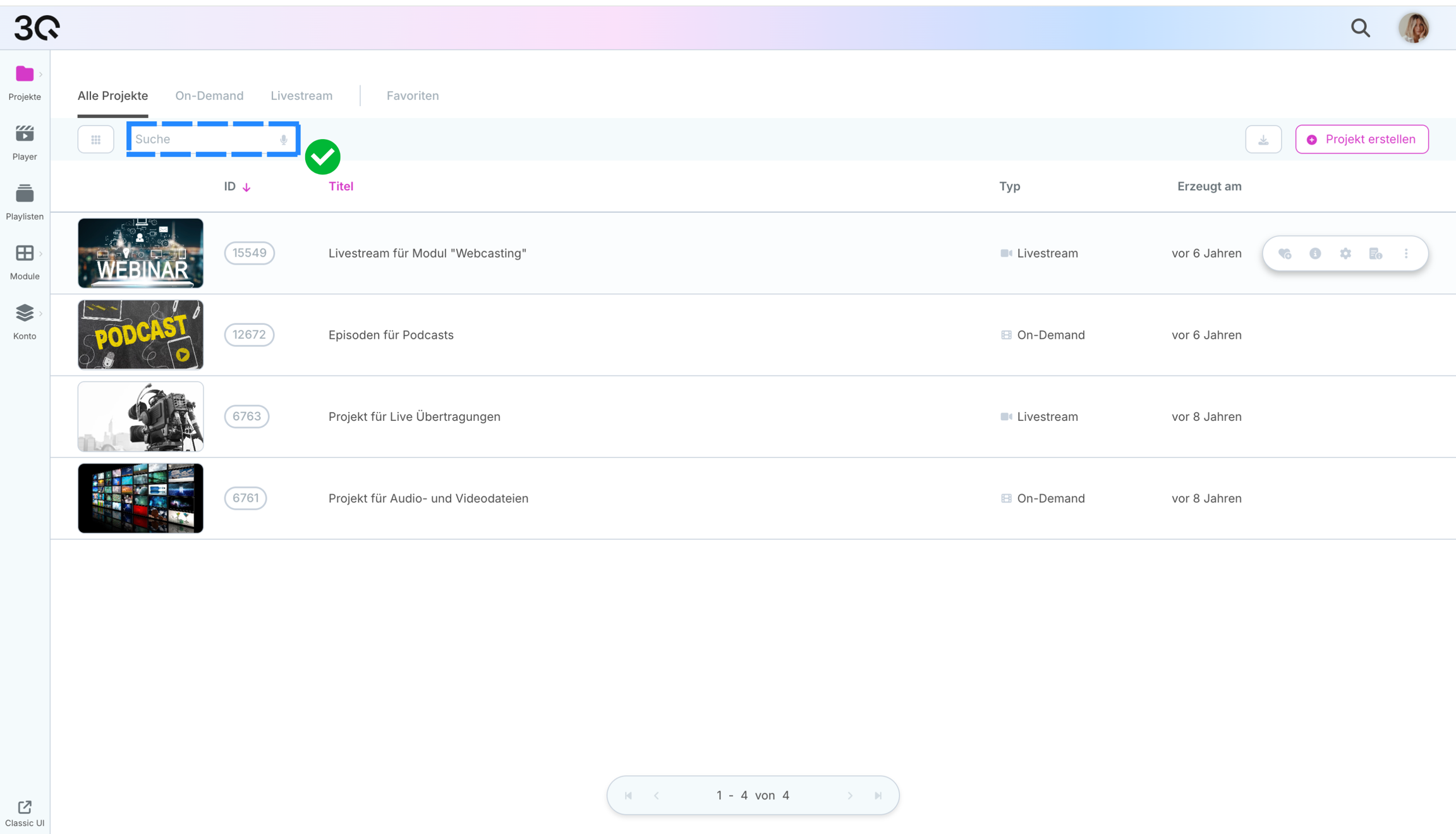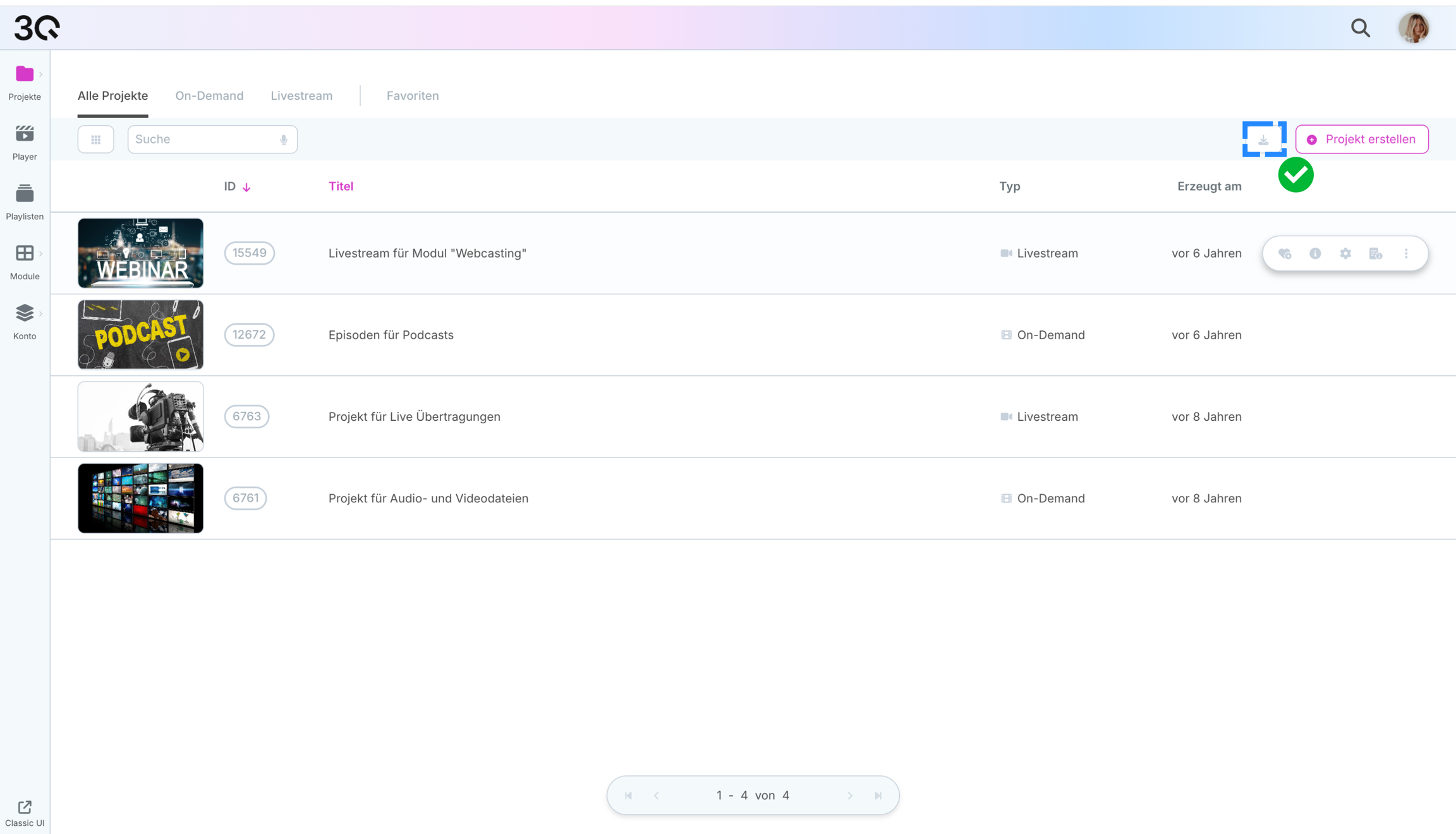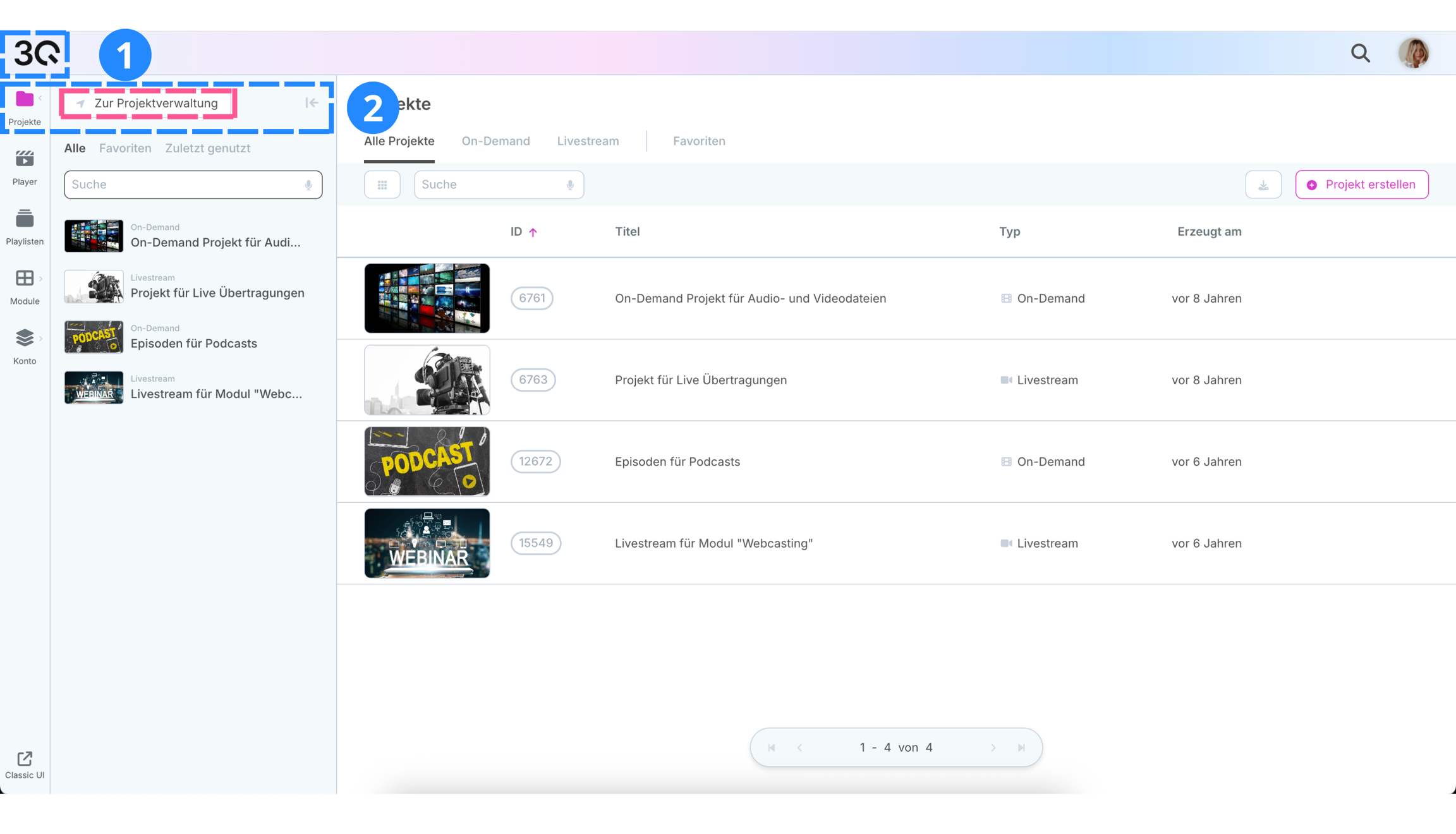 Zeigt den Projekttyp, On-Demand oder Livestream.