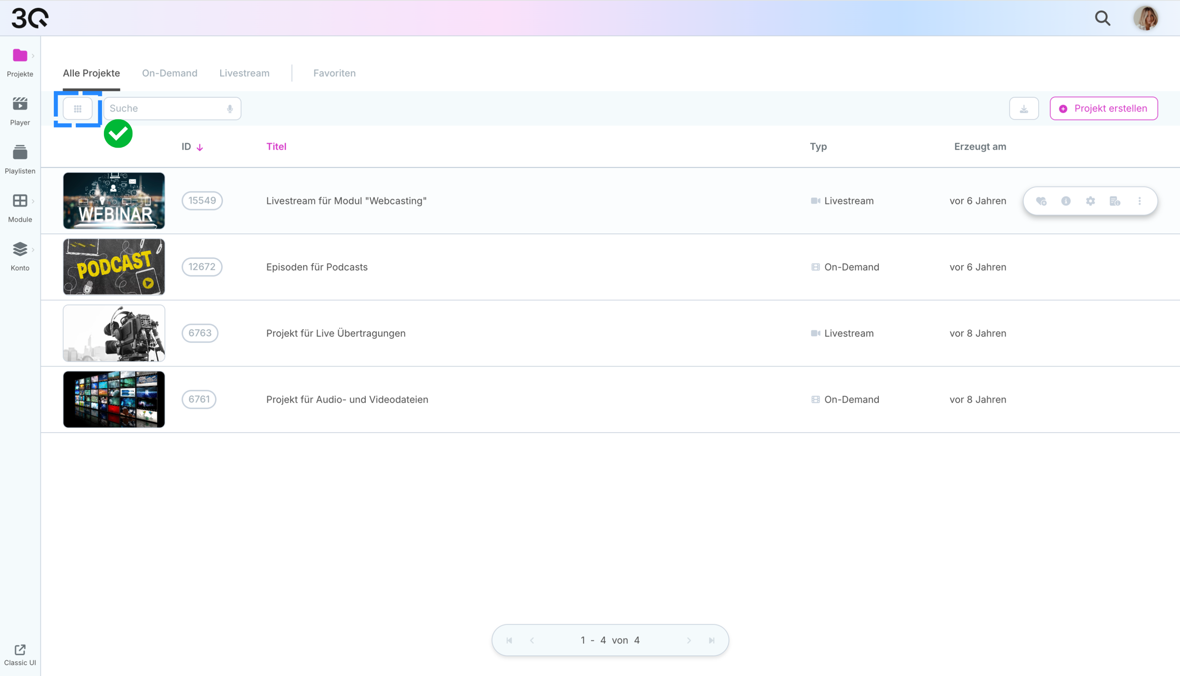 Projektübersicht in Kachel- oder Listensicht nutzen
